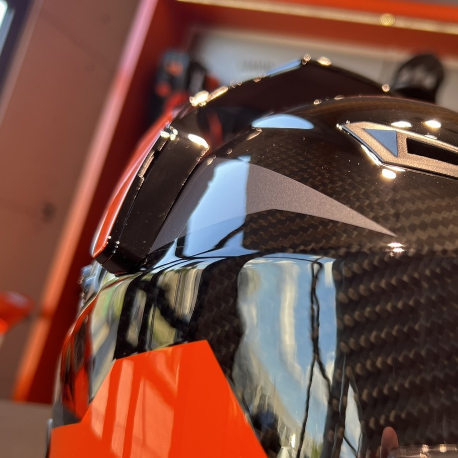 Skorupa kasku wykonana jest z kompozytu 82% karbonu, 11% aramidu i 7% włókna szklanego, co gwarantuje lekkość, wytrzymałość oraz doskonałą ochronę. Wnętrze jest wyjmowane i łatwe do prania, co podnosi higienę użytkowania, a odpinany ochraniacz na wiatr zwiększa komfort podczas jazdy w trudnych warunkach. Kask wyposażono w system podwójnego zapięcia typu Double D oraz wizjer z powłoką antyzarysowaniową i wkładką Pinlock® 120 MaxVision™, która zapobiega parowaniu. Regulowany daszek minimalizuje efekt „żagla” podczas jazdy, a mechanizm wizjera pozwala na płynną i wielostopniową regulację.