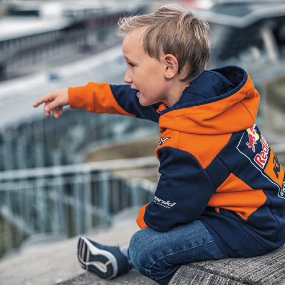 Bluza wyróżnia się wyrazistą kolorystyką w odcieniach pomarańczowym i granatowym, które są znakiem rozpoznawczym marki KTM. Sportowy charakter podkreślają detale i branding, które nawiązują do profesjonalnego świata wyścigów. To doskonała propozycja dla młodych pasjonatów motocykli, którzy chcą nosić odzież łączącą styl z funkcjonalnością, a także dla rodziców ceniących wysoką jakość i trwałość produktów KTM.