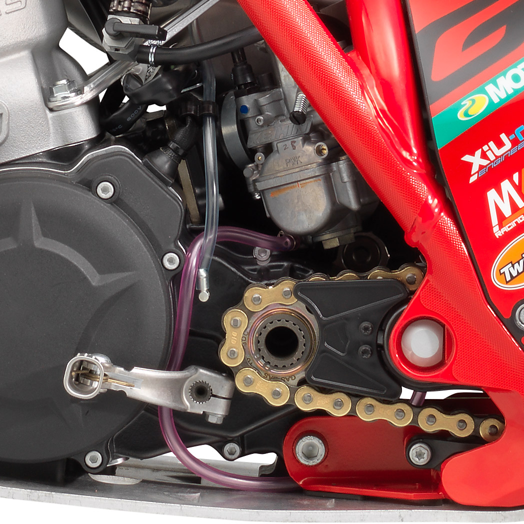 Jednocylindrowy silnik 2T o pojemności 247,7 cm³, średnicy cylindra 72,5 mm i skoku 60 mm wkręca się aż do 10 500 obr./min, oferując mocną, ale w pełni kontrolowalną charakterystykę. Lekka rama z chromowo-molibdenowej stali 25CrMo4 waży zaledwie 6 kg , a całkowita masa motocykla bez paliwa to tylko 67,9 kg . To przekłada się na niesamowitą zwrotność i czucie przodu w ciasnych sekcjach.
