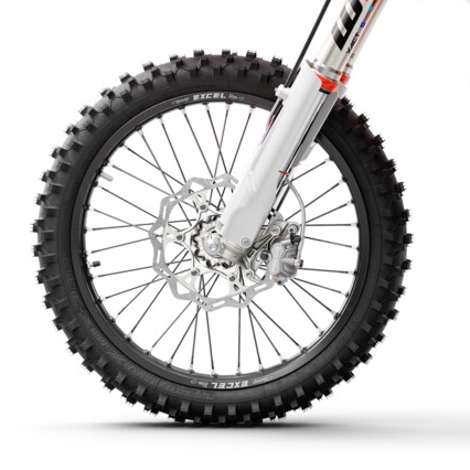 Lekkie, obrabiane CNC piasty są owinięte, lekkimi, aluminiowymi obręczami Excel i są wyposażone w opony Dunlop Geomax MX33 dla maksymalnej przyczepności i wydajności.
