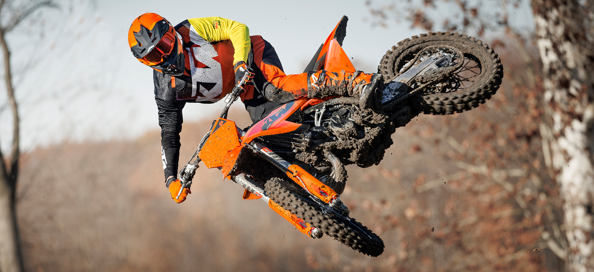 Nie naśladuj stylu jazdy przedstawionego na zdjęciach! Przedstawieni zawodnicy to zawodowi motocykliści. Zdjęcia zostały wykonane na zamkniętych torach wyścigowych lub zamkniętych drogach. KTM pragnie uświadomić wszystkich motocyklistów, że podczas jazdy muszą stosować odzież ochronną i zawsze jeździć w sposób odpowiedzialny, zgodnie z obowiązującymi przepisami ruchu drogowego.