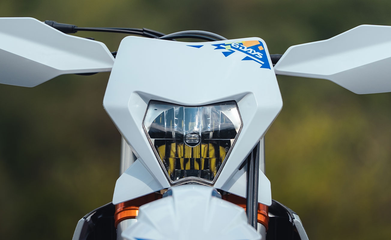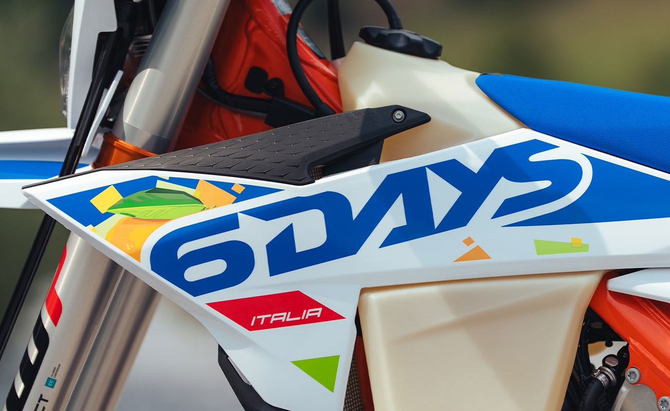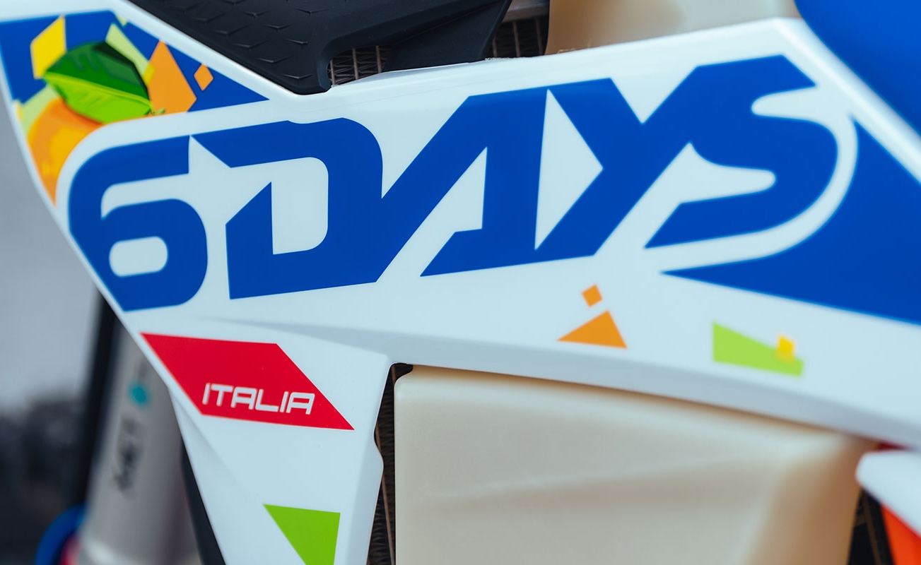 - Zachowany pakiet 6DAYS – seryjnie (m.in. specjalne koła, osłona silnika, osłona tarczy hamulcowej, osłony przedniego widelca)