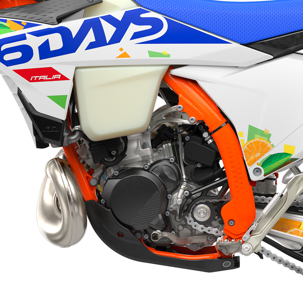 Sercem maszyny pozostaje legendarny dwusuw 293 cm³ z elektronicznym wtryskiem Throttle Body Injection (TBI). Oferuje on potężny moment od dołu, doskonałą trakcję w technicznych sekcjach i natychmiastową reakcję na gaz, gdy trzeba przyspieszyć na otwartych odcinkach. Wersja 6DAYS ma seryjny przełącznik map zapłonu (Map 1 / Map 2), co pozwala błyskawicznie dopasować charakter silnika do warunków.