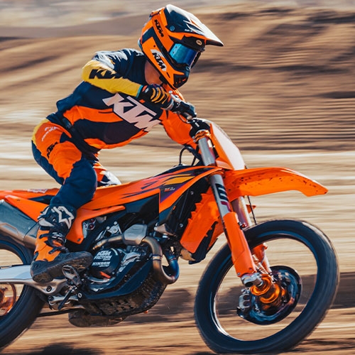 Czterosuwowy silnik o pojemności 349,7 cm³ został zaprojektowany tak, aby oferować użyteczną moc w całym zakresie obrotów. To właśnie charakterystyka napędu sprawia, że KTM 350 SX-F jest tak ceniony przez zawodników – motocykl nie męczy, pozwala jechać równo przez cały wyścig i zachować pełną kontrolę nawet pod koniec biegu. Seryjne Launch Control, Quickshifter, kontrola trakcji oraz dwie mapy zapłonu pozwalają dostosować reakcję motocykla do toru i warunków.