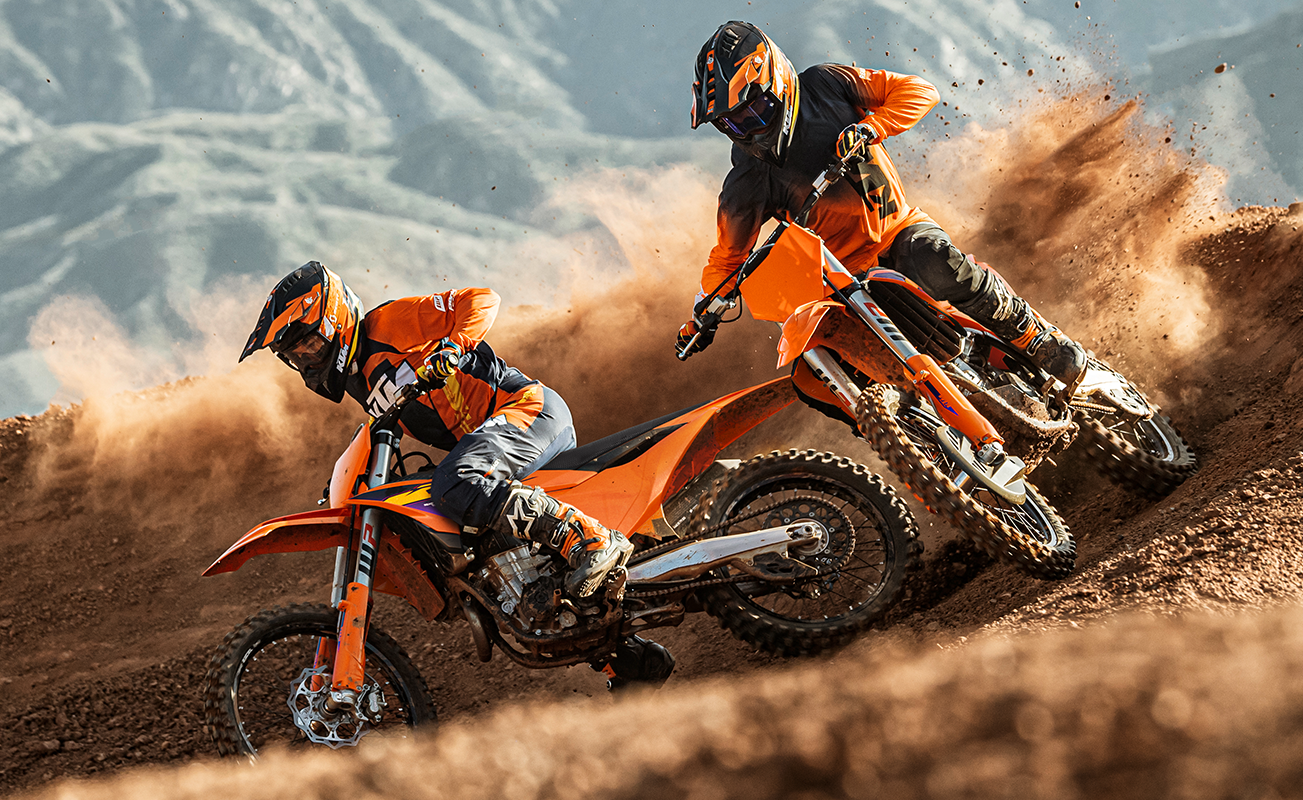 Czterosuwowy silnik SOHC o pojemności 449,9 cm³ to jedna z najmocniejszych i najbardziej zaawansowanych jednostek w motocrossie. Ogromna siła napędowa idzie tu w parze z kontrolą – dzięki dwóm mapom zapłonu, kontroli trakcji, Launch Control oraz Quickshifterowi, które są seryjnym wyposażeniem. KTM 450 SX-F pozwala brutalnie przyspieszać, ale jednocześnie utrzymać pełną precyzję na wyjściach z zakrętów i w głębokich koleinach.