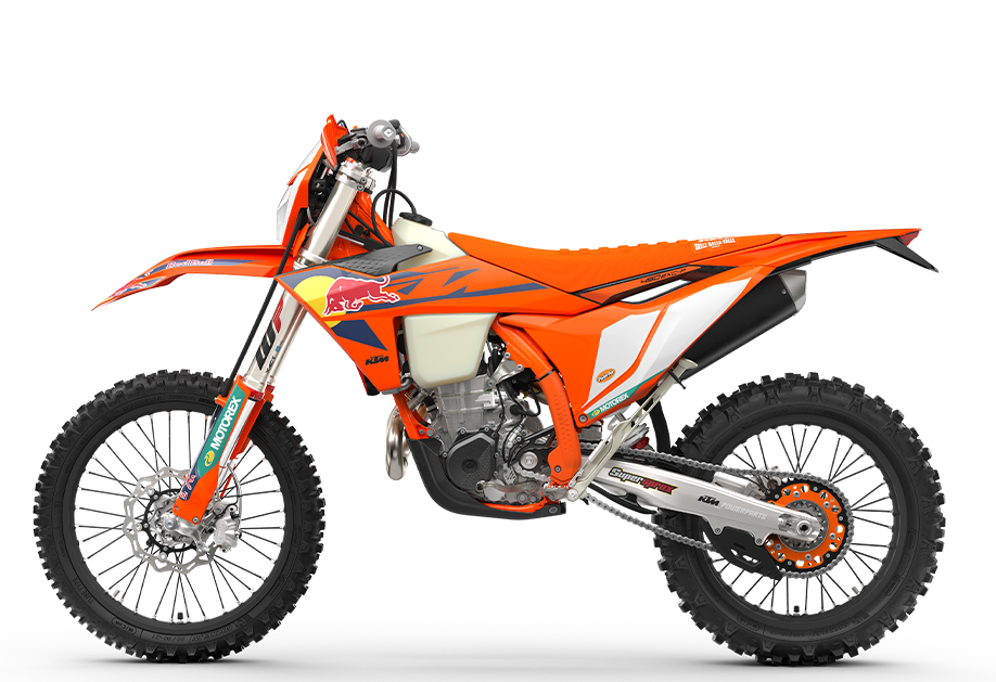 Wersja CHAMPION EDITION wyróżnia się bogatym wyposażeniem fabrycznym inspirowanym maszynami KTM Red Bull Factory Racing. Zawieszenie WP XACT Closed Cartridge z przodu oraz WP XPLOR PDS z tyłu zapewniają stabilność, trakcję i łatwą regulację bez użycia narzędzi. To motocykl dla zawodników i ambitnych riderów, którzy chcą sprzętu klasy mistrzowskiej – bez dalszych inwestycji po zakupie.