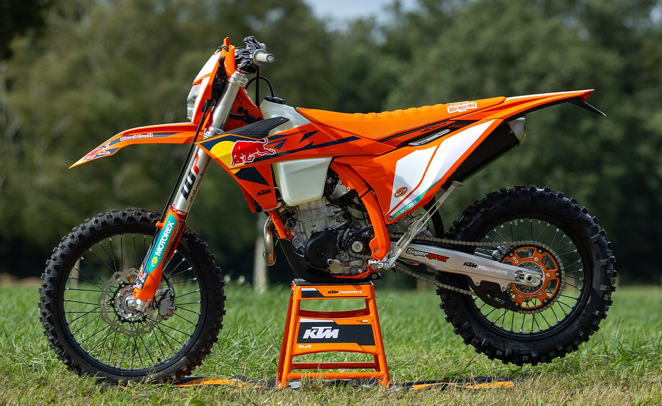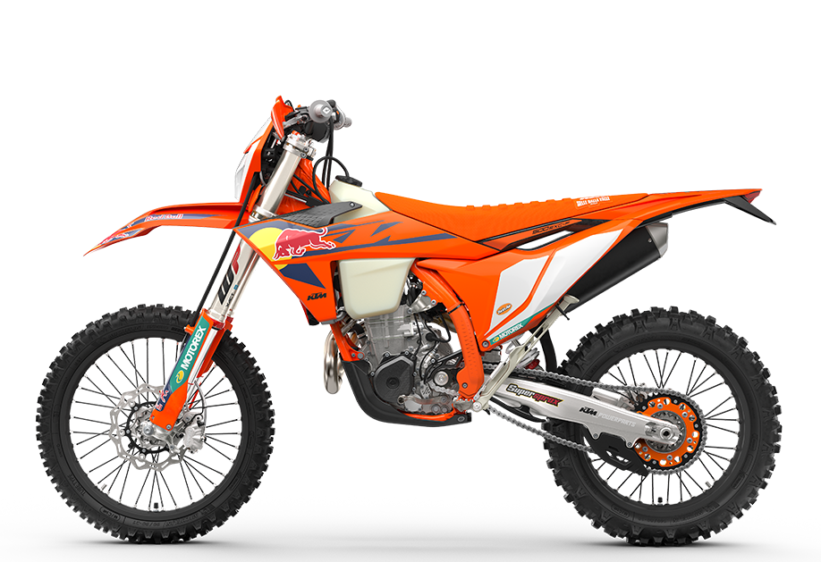 Wersja CHAMPION EDITION to również realne doposażenie zwiększające trwałość i funkcjonalność w enduro. Zawieszenie WP XACT Closed Cartridge z przodu oraz WP XPLOR PDS z tyłu zapewniają stabilność przy dużych prędkościach oraz kontrolę w technicznych sekcjach. To motocykl homologowany, gotowy zarówno do zawodów, jak i do najcięższych wypraw terenowych.